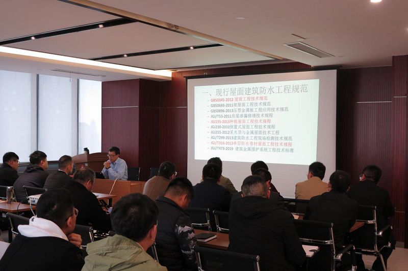 培訓(xùn)總時長約2小時,邀請中國建材檢驗認(rèn)證集團(tuán)蘇州有限公司的防水專家朱志遠(yuǎn)作為本次會議的主講嘉賓,旨在增強(qiáng)相關(guān)技術(shù)人員在實際防水工程中質(zhì)量控制,了解現(xiàn)行規(guī)范及行業(yè)趨勢,提高防水意識。培訓(xùn)中,朱志遠(yuǎn)專家針對屋面防水材料及應(yīng)用、《屋面工程技術(shù)規(guī)范》、《坡屋面工程技術(shù)規(guī)范》、《種植屋面工程技術(shù)規(guī)程》、《單層防水卷材屋面工程技術(shù)規(guī)程》、施工技術(shù)和施工過程中易出現(xiàn)的問題和誤區(qū)進(jìn)行了詳細(xì)的培訓(xùn)講解。